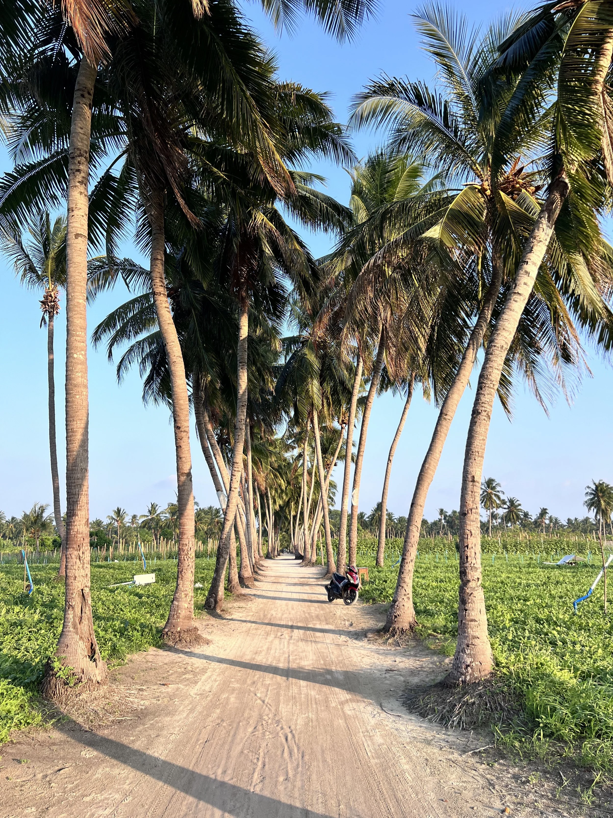 The most beautiful alley of Thoddoo with big palm trees, across plantations towards the sunset beach.
